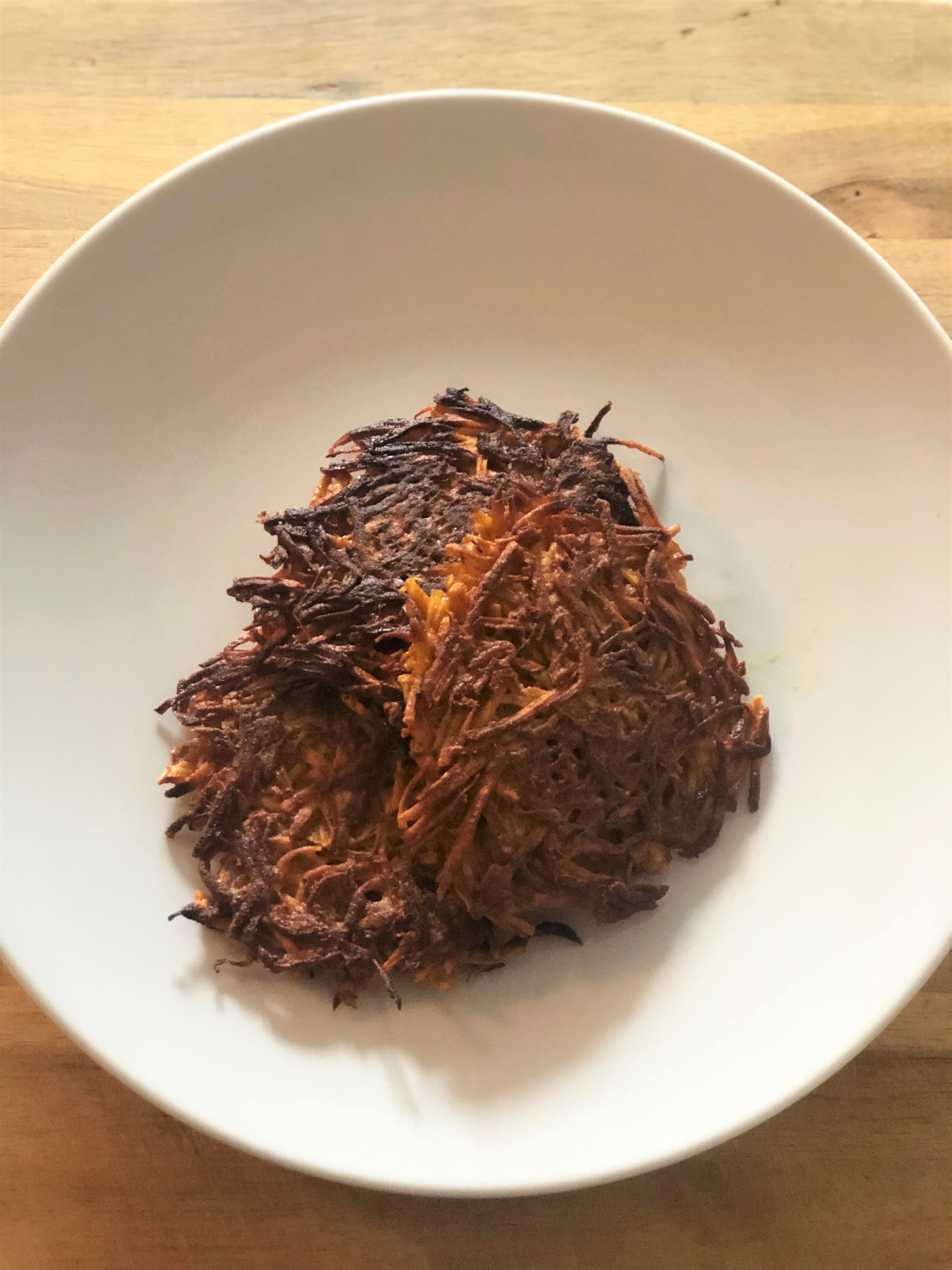 - In a large bowl, grate sweet potato and place in napkin to squeeze excess liquid